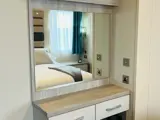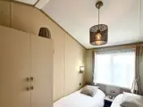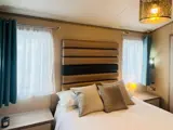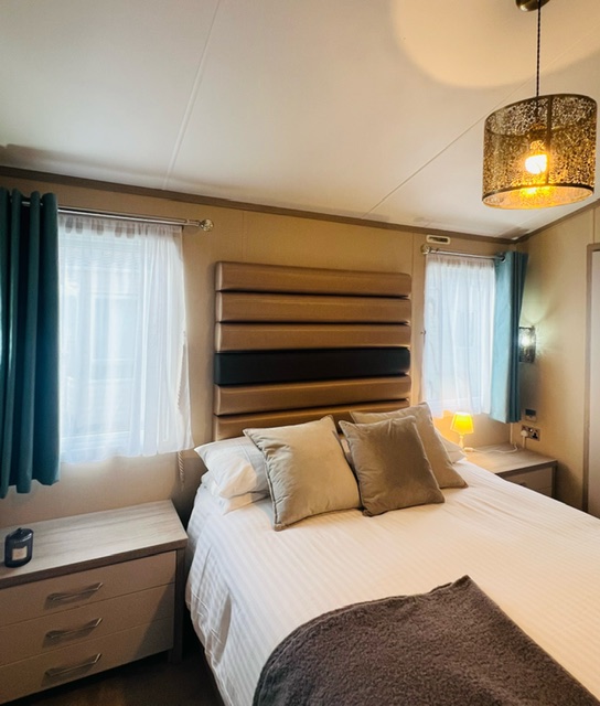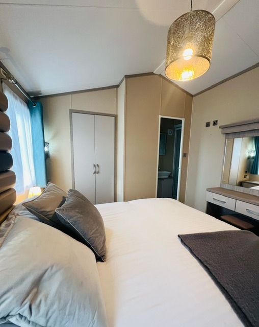 The stylish master bedroom has a double bed with lift up storage system, feature upholstered headboard, mounted reading lamps, wardrobe, dressing table, and en suite shower room.