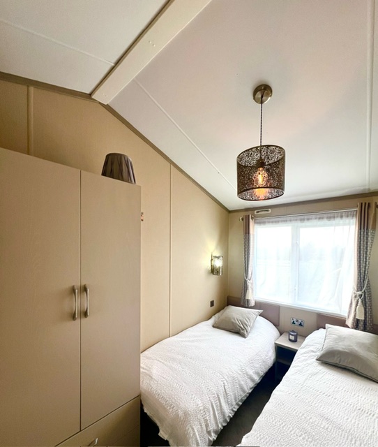 The twin bedroom has 2ft 6" beds with a central bedside table, wardrobe, and TV point, with access to the family shower room.