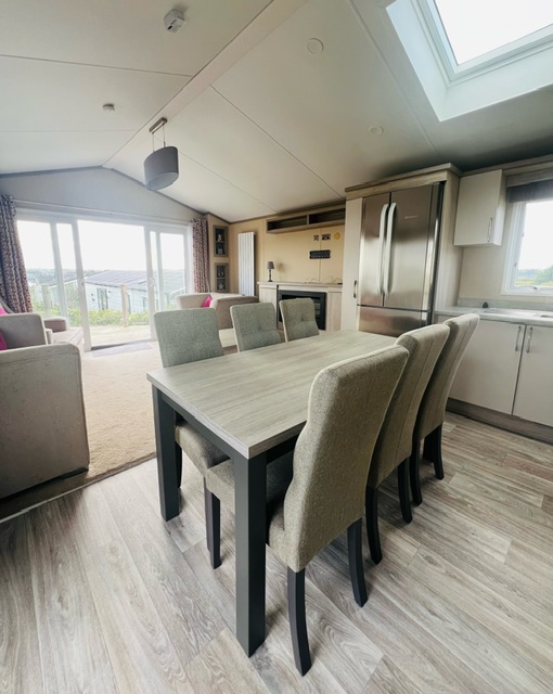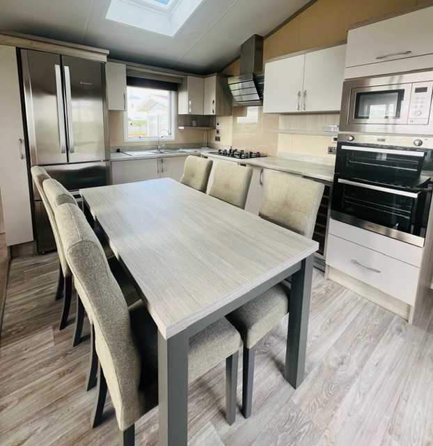 Move through to the star of this holiday home, the incredible kitchen bathed in light from the well placed skylight. You'll find a large American style fridge freezer, eye level double oven, separate 5 burner hob with designer cooker hood, integrated microwave and wine fridge, alongside 40mm worktops as well as soft close cabinets and drawers.
