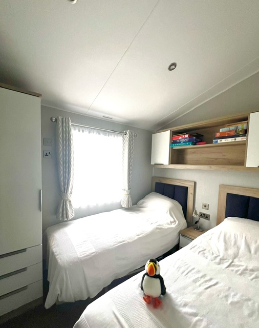 The twin bedroom boasts their own feature upholstered headboards in the same style as the master, alongside a central bedside cabinet, overhead storage and wardrobe, with access to the family shower room across the hall.