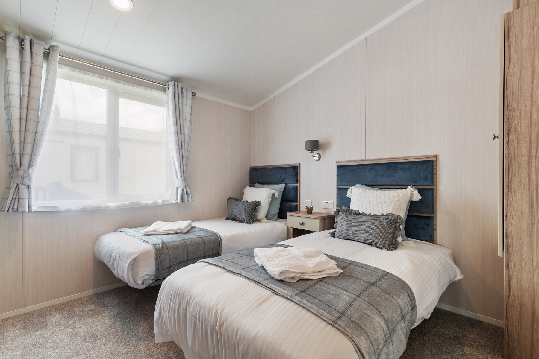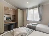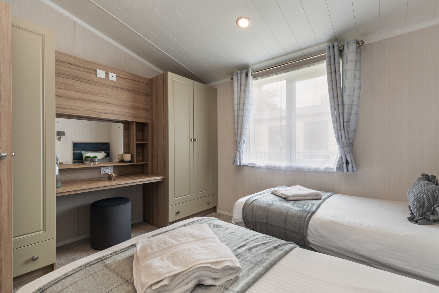 The twin bedroom boasts two 3ft wide beds with Aurora Duvalay™ mattresses, padded headboards, reading lights, double wardrobe with drawers and its own vanity area with mirror, shelf, socket and cube stool.