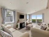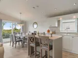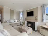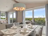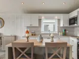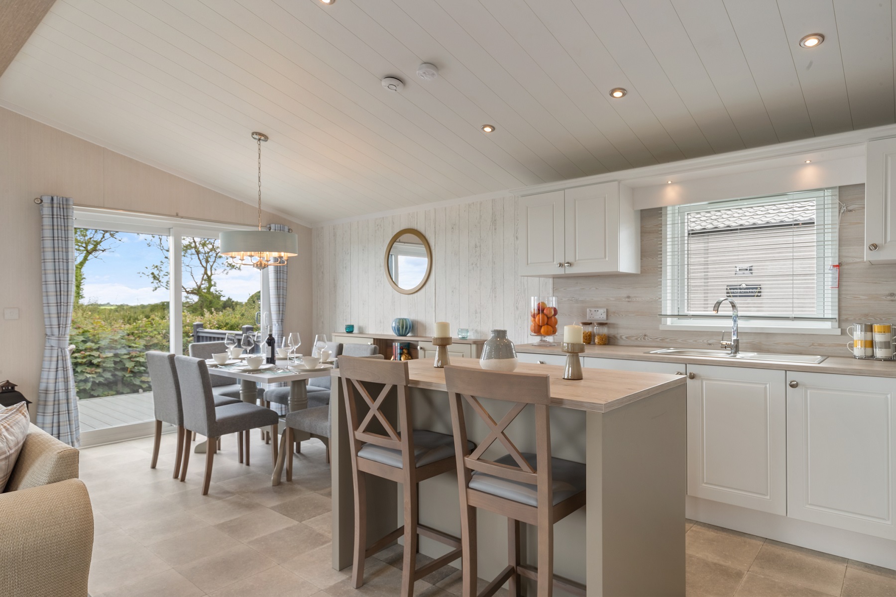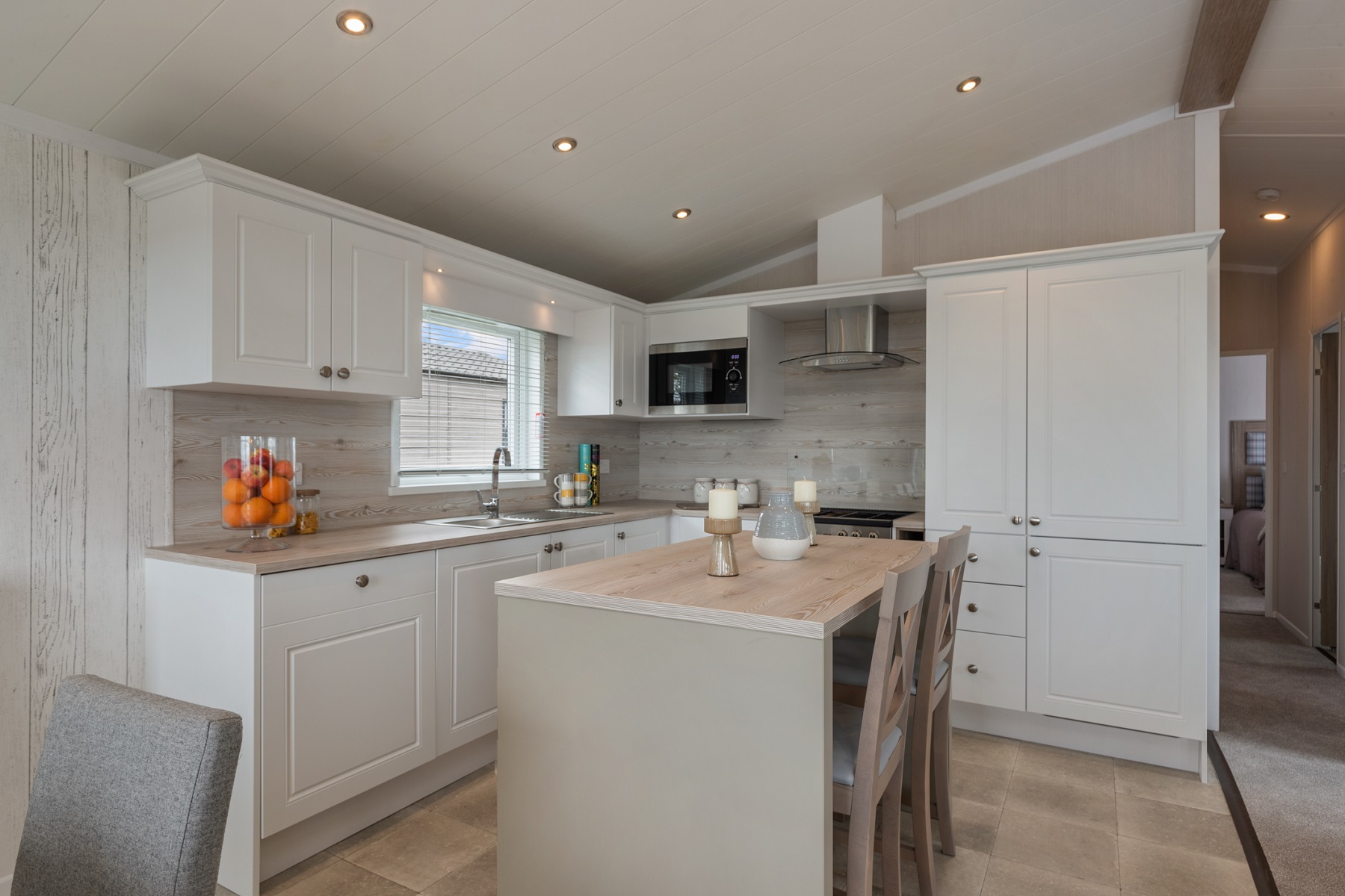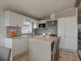 Walk around to the stylish yet functional shaker style kitchen with integrated appliances, like the large fridge/freezer and microwave, and gorgeous glass fronted electric Thetford oven and grill with four burner gas hob. In the centre, the kitchen island/breakfast bar opens up even more counter space. The dining area features a freestanding Bella Twin table with six chairs, sideboard, round wall mirror and statement pendant light.