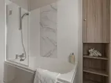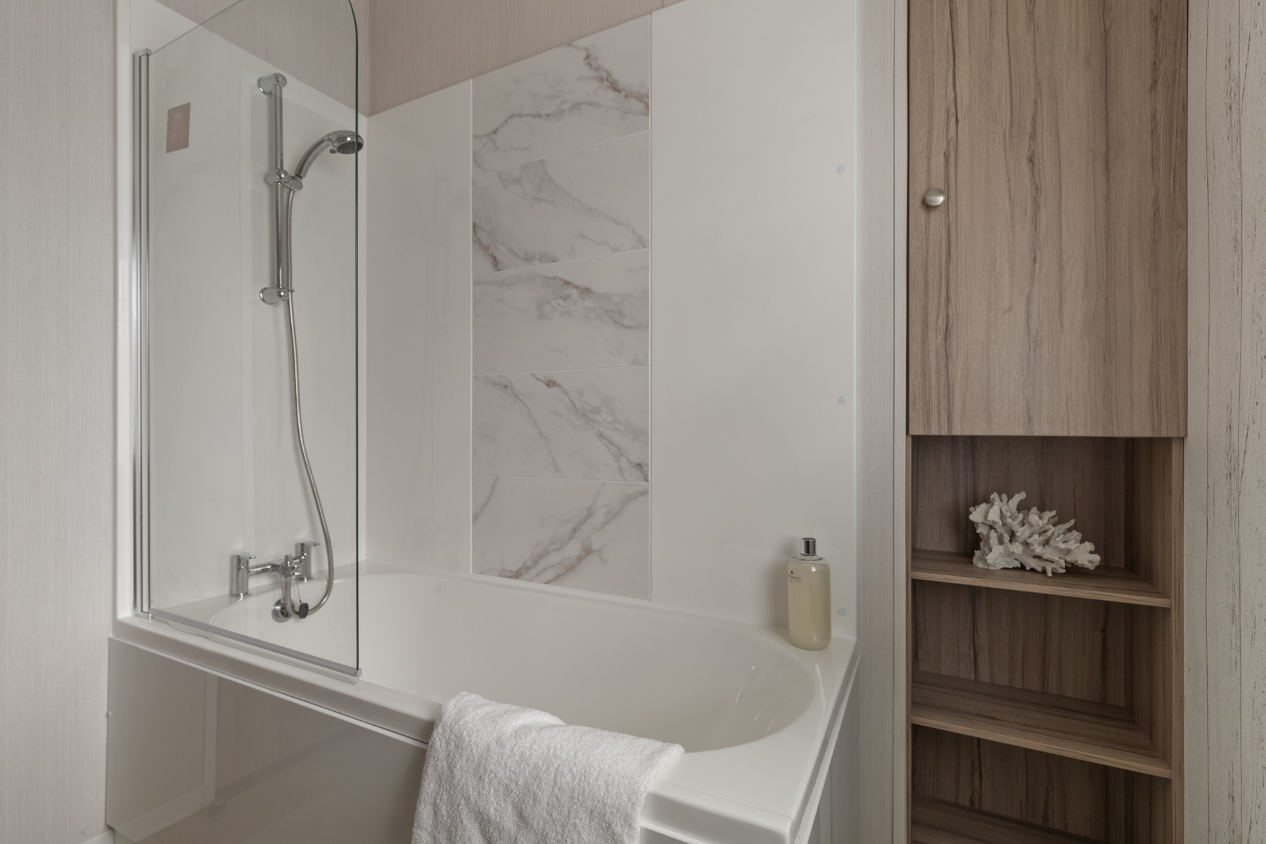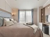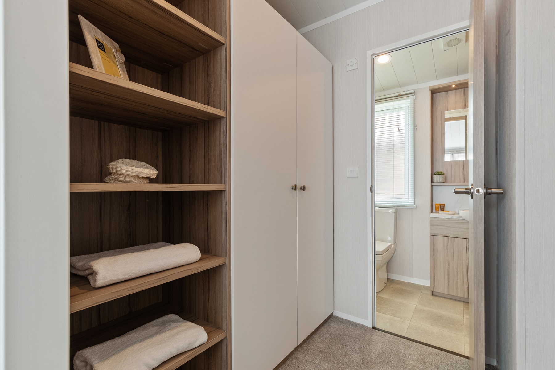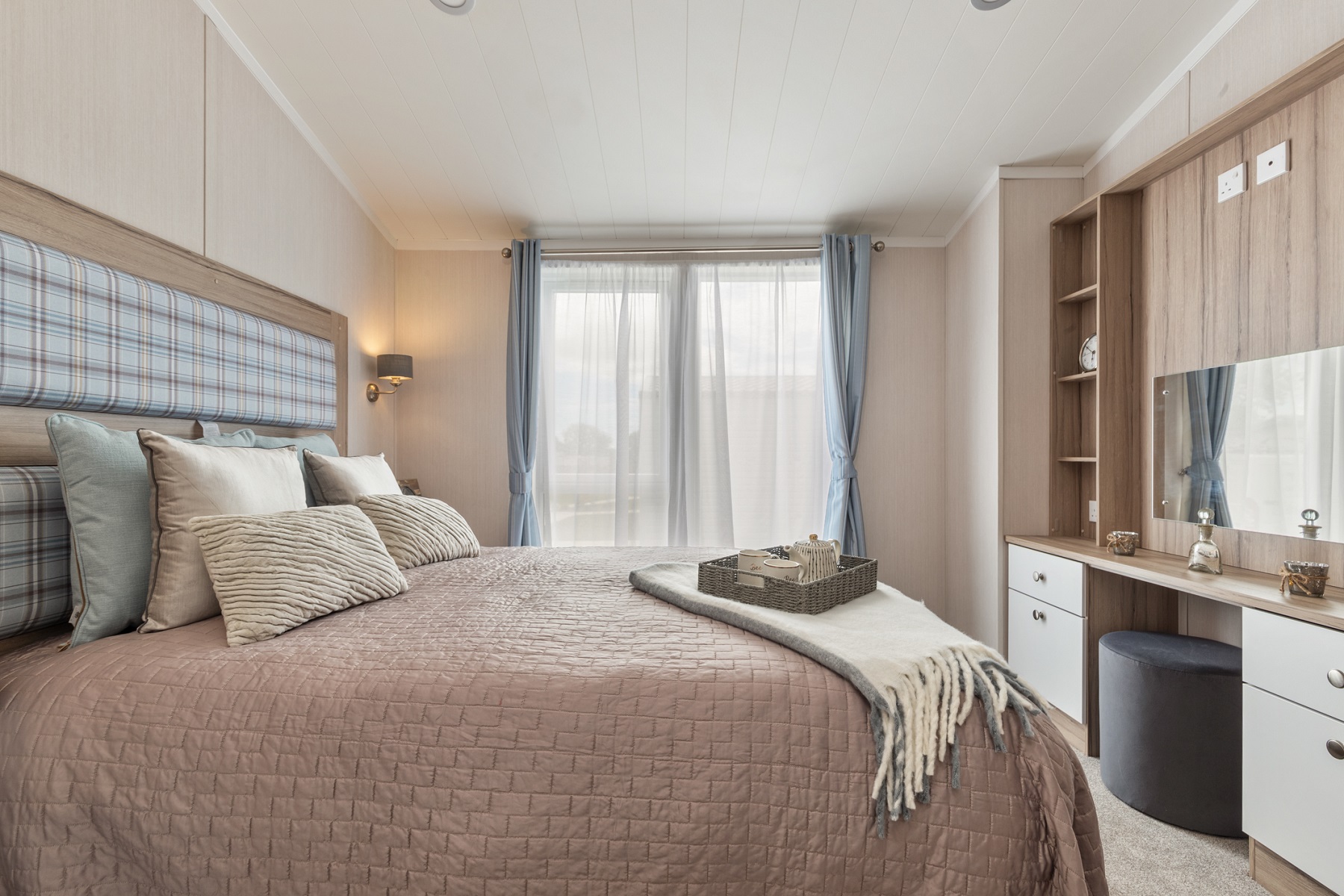 Within the large master bedroom you'll find a king size bed with lift up storage system and Duvalay™ Alba-Ortho mattress, feature upholstered headboard, bedside tables and wall lights, as well as a stunning walkthrough dressing area with large wardrobes, and vanity unit with masses of storage, cube stool and overhead TV position. The master en-suite shower room features an inset vanity basin and thermostatic shower.