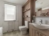 The style continues into the family washroom where you'll not only find the bath with thermostatic shower, but the inset vanity basin, Levanto Marble vanity splashbacks, LED illuminated vanity mirrors with infrared sensors and demisting pads and large feature vanity cupboard.